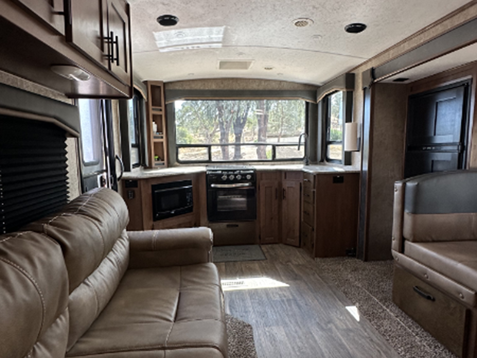 The 26KVS accommodates 5 people. This one comes with a private master queen bedroom with an upgraded mattress. Bring your cards and board games, this dinette is the widest in the industry @ 6” 11” wide and seats four very comfortable with an oversized dining table. This table will break down into a bed and sleep 1 adult or two kiddos. The sleeper sofa will also break down into a bed. Enjoy the amazing rear kitchen in this unit with large windows to enjoy the great outdoor views.