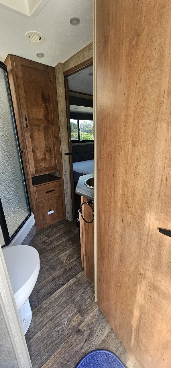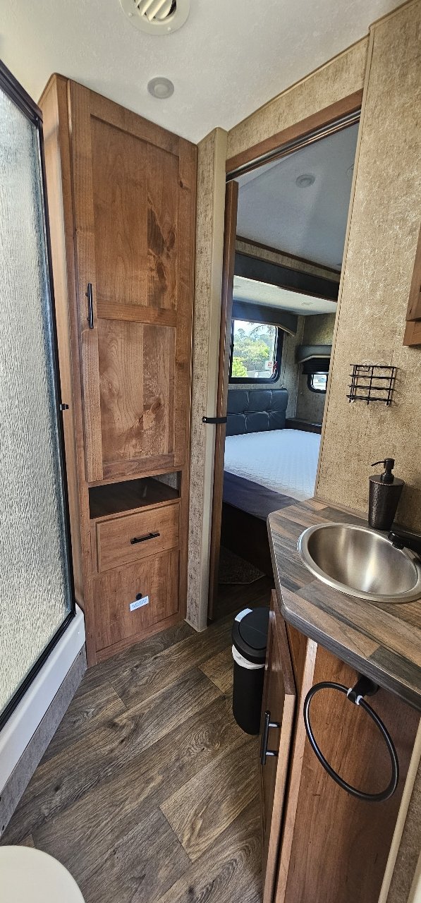 The bathroom has an adequately sized shower (shower only) sink and toilet with plenty of cabinet space. The Outdoors RV Units come with 10 Gallon water heaters. The bathroom has a Jack and Jill entrance.