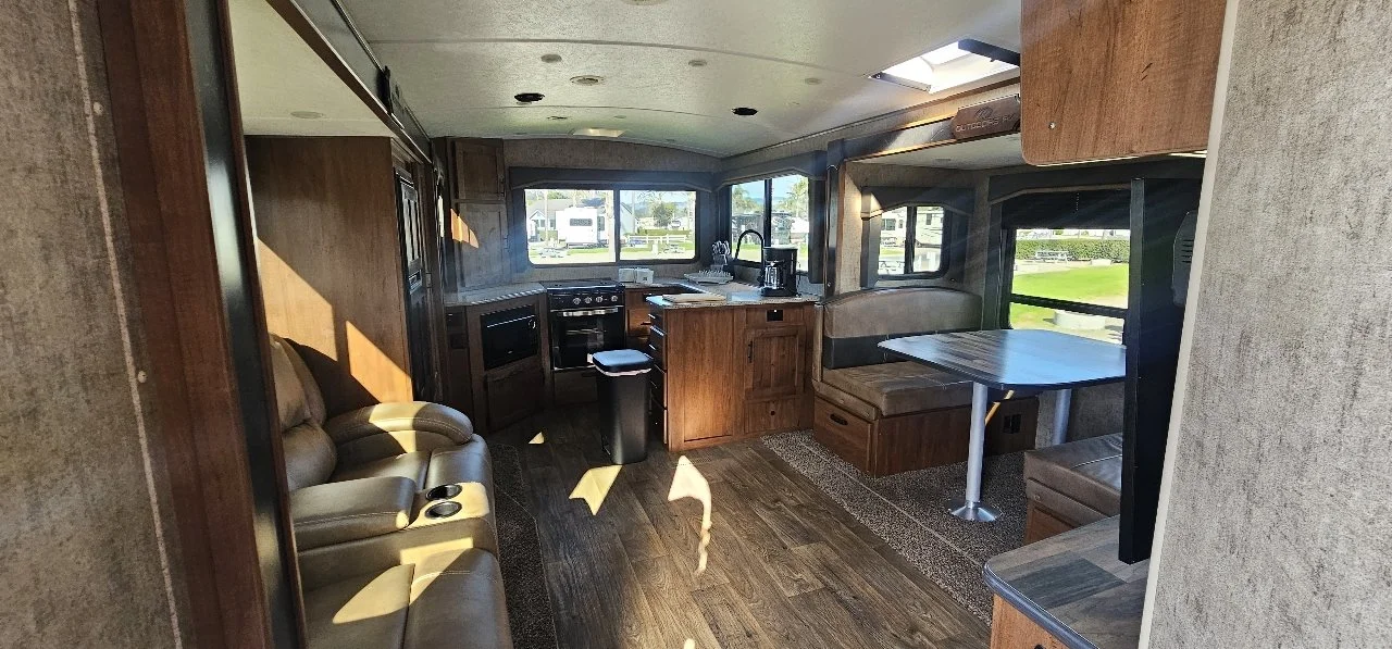 The Outdoors RV is quality at its finest with solid wood cabinetry, and a true 4 seasons travel trailer. You will recognize the difference when you immediately walk through the door. With a ceiling height of 6’ 11” you feel the openness of this unit.
